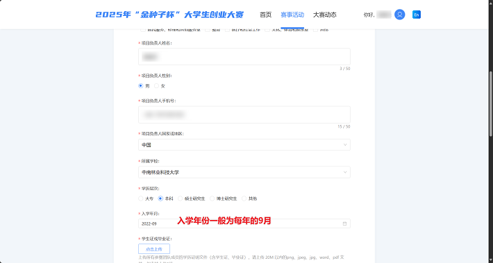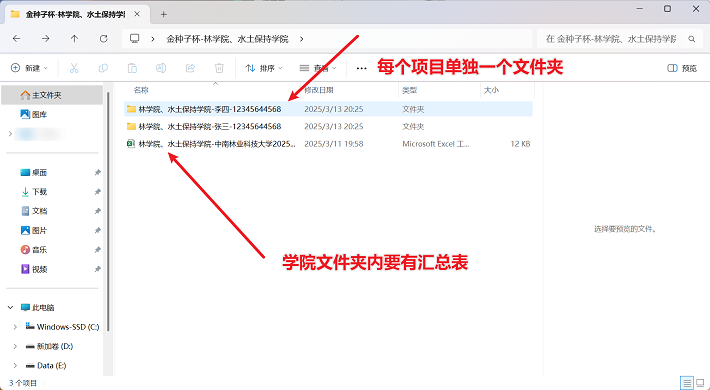 报名阶段(3月12日至3月25日):各学院负责收集本学院参赛团队参赛资料,每个团队参赛资料建立一个文件夹以“学院-项目负责人姓名-电话号码”命名。并于3月25日17:30前将中南林业科技大学2025年“金种子杯”大学生创业大赛校赛汇总表(附件1)纸质档反馈至崇德楼503教务处(创新创业学院)杨平老师处,汇总表(附件1)须由学院分管院长签字并盖章。本学院所有参赛资料打包发送至指定邮箱znlcxcy@qq.com。
